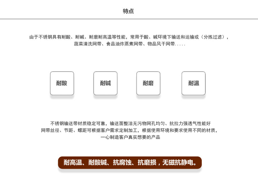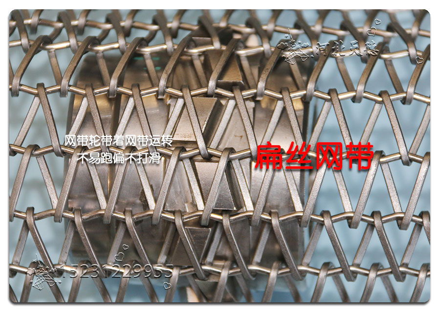 直軸型網帶:由左右交替的網條通過直串條聯結而成,該系列網帶網孔較密,網孔間距均勻,能使網帶行走平穩。該系列網帶適合于承載體積較小而質地相對較重的輸送線。