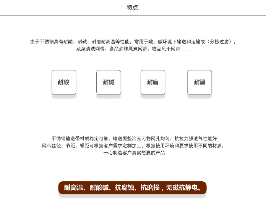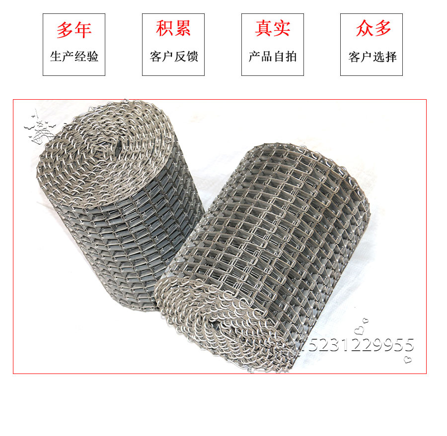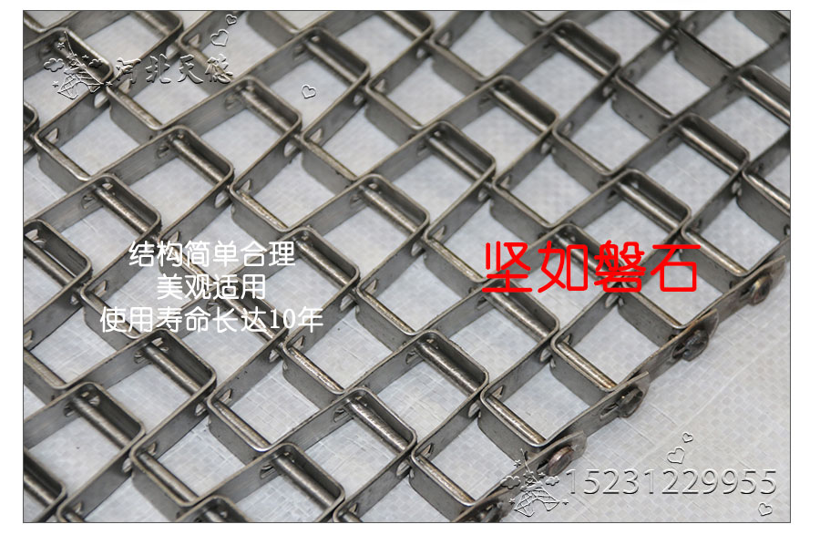 長城網帶材質:有A3低碳鋼、45#鋼、1Cr13耐熱鋼、 不銹鋼、304不銹鋼、1Cr18Ni9Ti不銹鋼、0Cr18Ni14NO2CU2耐熱耐酸鋼等