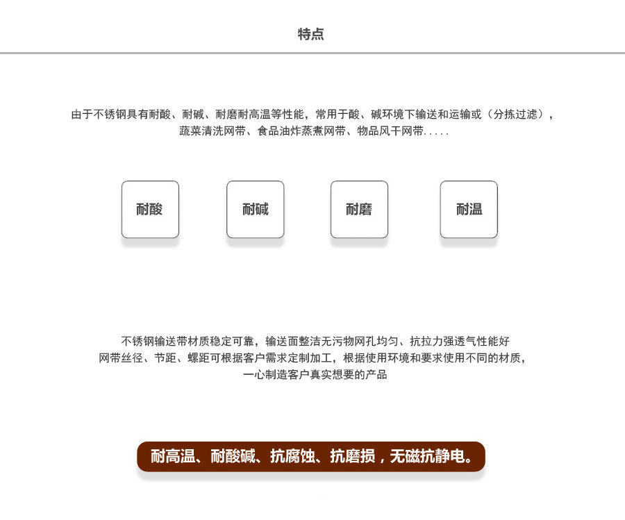 人字形網帶應用:主要應用于食品烘干機、蔬菜、海產品清洗機,巴氏機,方便面米粉蒸煮、熱收縮膜包裝機。玻璃瓶罐、食品、燈炮、金屬、器皿、化纖、印染、醫藥、電子、粉末冶金、熱處理、木材、物流輸送等各行業自動裝置和自動流水線的使用;焦爐煤氣及電子紅外線等各種窯爐系統的傳動使用等食品機械,玻璃機械,輸送機械。