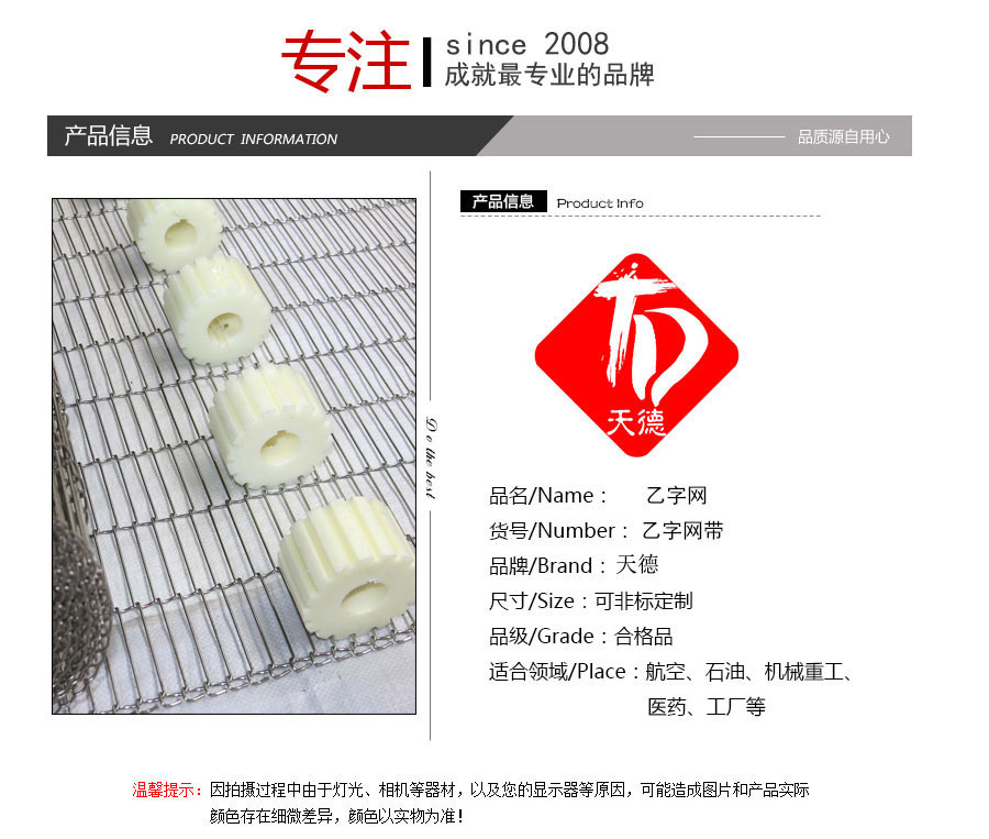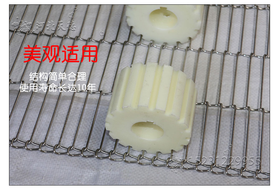 乙字網(wǎng)帶:又稱梯形網(wǎng)帶或一字網(wǎng),此網(wǎng)帶通常系齒輪傳遞網(wǎng)帶,具有透氣性好的優(yōu)點(diǎn),拉力均勻,做工精細(xì),此網(wǎng)帶具有轉(zhuǎn)動(dòng)靈活、平穩(wěn)性好、耐高溫、耐壓力、耐腐蝕、壽命 長(zhǎng)等特點(diǎn)。主要用于餅干機(jī)圖層,輕物品輸送及電子回流焊等